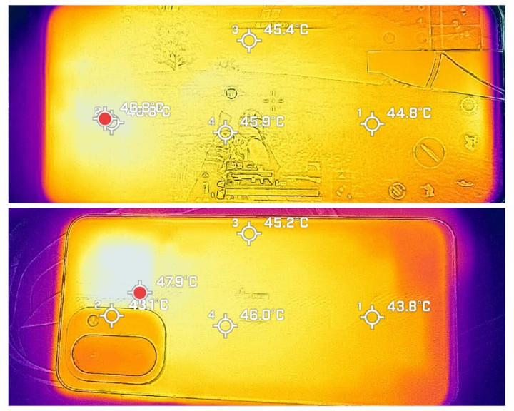 游戏结束之后,红外测温仪实测一加Ace 6T机身背面最高温度达到47.9℃,手机屏幕的最高温度为46.8℃。