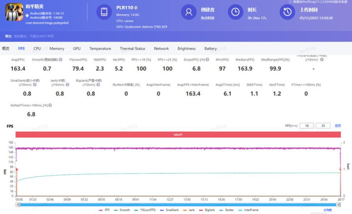 而且,这一次一加Ace 6T还首发上线了《和平精英》的流畅模式下165高帧率,实测可以一直稳定在165帧左右,一局玩下来平均游戏帧率163.4帧,游戏体验流畅,相应功耗增加至6.56W。