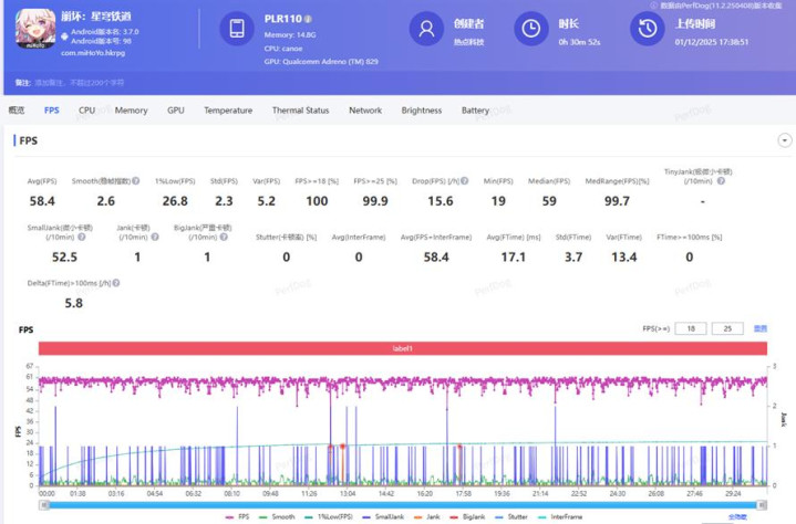 实测一加Ace 6T的平均游戏帧率为58.4帧,1%Low帧为26.8帧,游戏帧率虽然有所波动,但是基本可以一直维持在60帧上下,游戏体验整体比较流畅。对比之前测试的骁龙8至尊版机型,游戏帧率的走势要稳定不少。