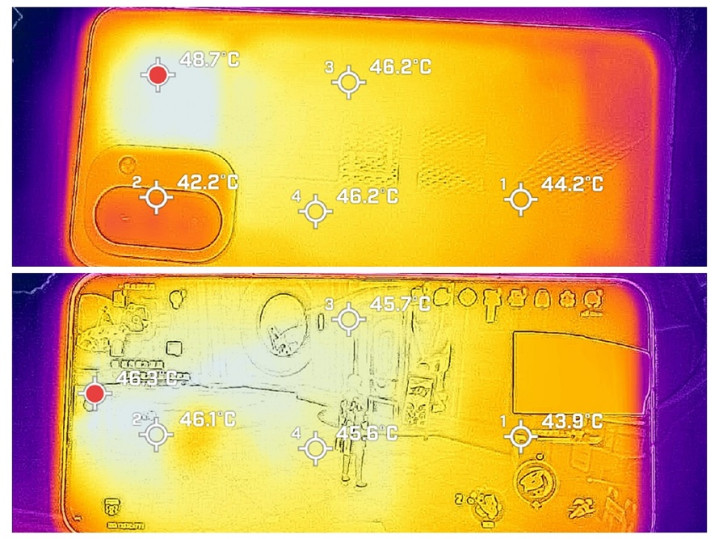 30分钟游戏之后,使用红外测温仪测量了手机的温度,一加Ace 6T的背面温度达到48.7℃,正面温度达到了46.3℃。